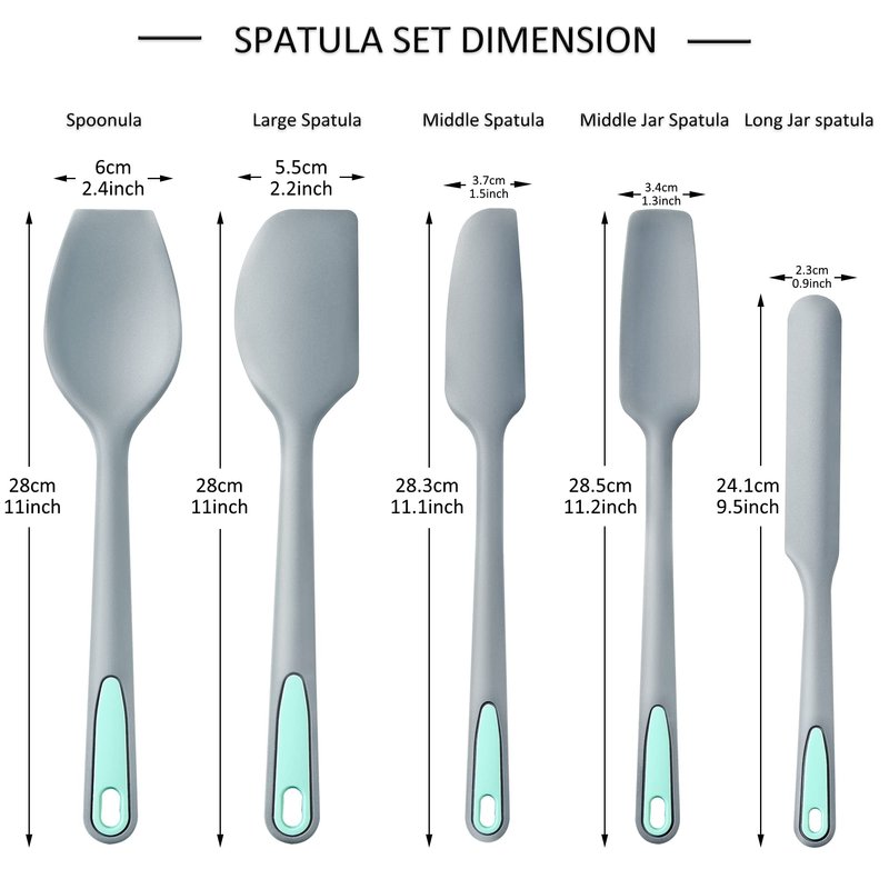 - 5-Piece Kitchen Spatula Set - 1 Long Jar Spatula, 1 Middle Jar Spatula, 1 Large Spatula, 1 Middle Spatula, 1 Spoonula, different sizes to meet different needs.