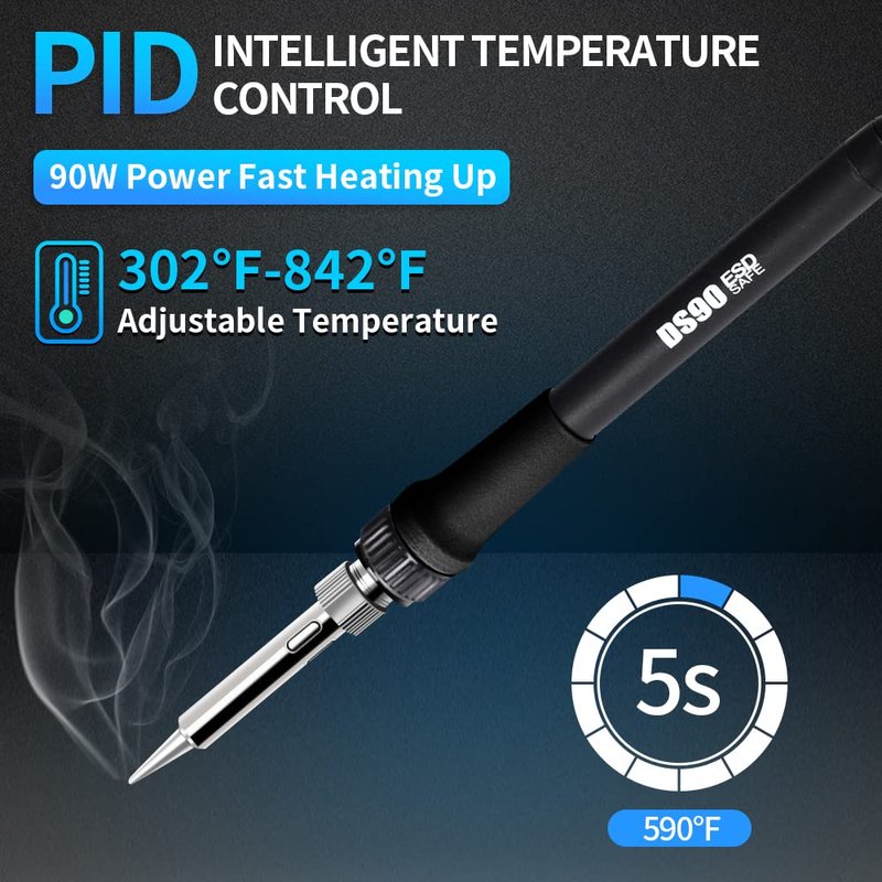 - 【FAST HEATING & AUTO STANDBY SLEEP】DS90 Soldering Station uses a 90W High power ceramic heating core, heats up quickly, a soldering temperature of 590 °F is reached after about 5 seconds. When not used for 10 minutes, the soldering station automatically enters standby mode, when not used for 20 minutes, it will automatically enter sleep mode. Protecting you, your kids, and your pets from getting hurt.