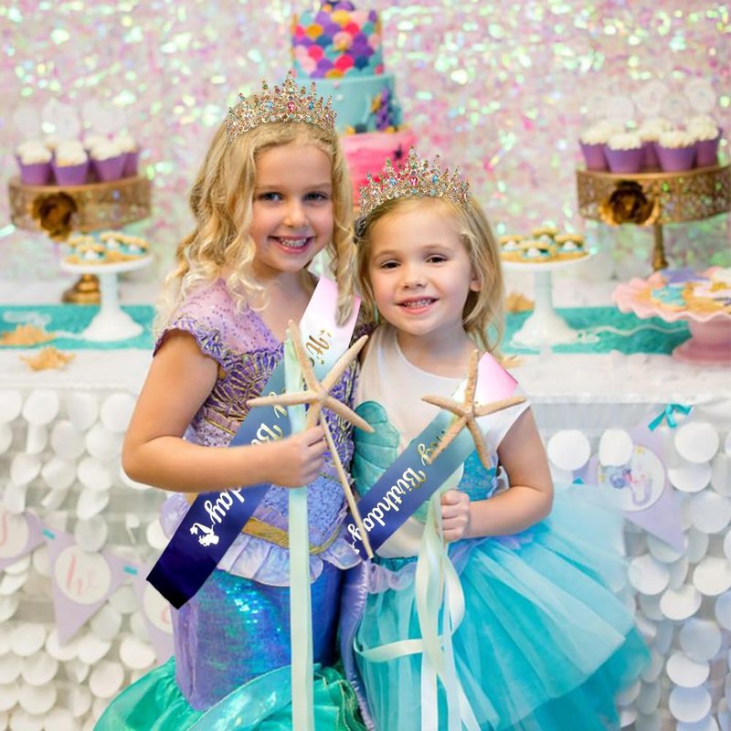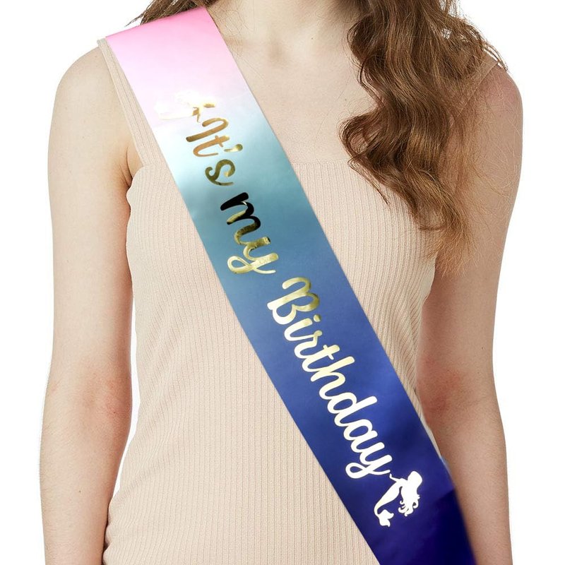 - 🎁 Mermaid Birthday Sash: This mermaid birthday sash features a multicolored fabric type material with gold foil letters that spell out "It's my Birthday". Each sash measures 3.75inch wide and total 62inch long, suitable for all girls. It comes with a exquisite safety pearl pin for closure and it can adjust sash to their exact needs.