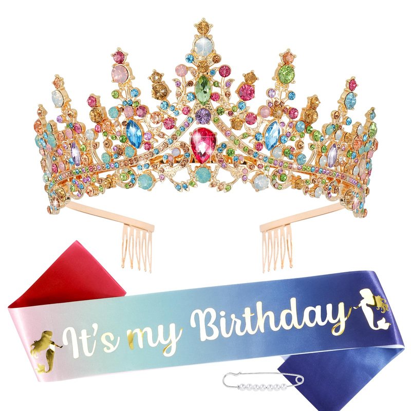 TOBATOBA It's My Birthday Sash Birthday Tiara and Crown for Women Girls Mermaid Birthday Girl Sash and Tiara Set Crystal Princess Tiara Queen Crown Quinceanera Crown Birthday Decoration Birthday Gift