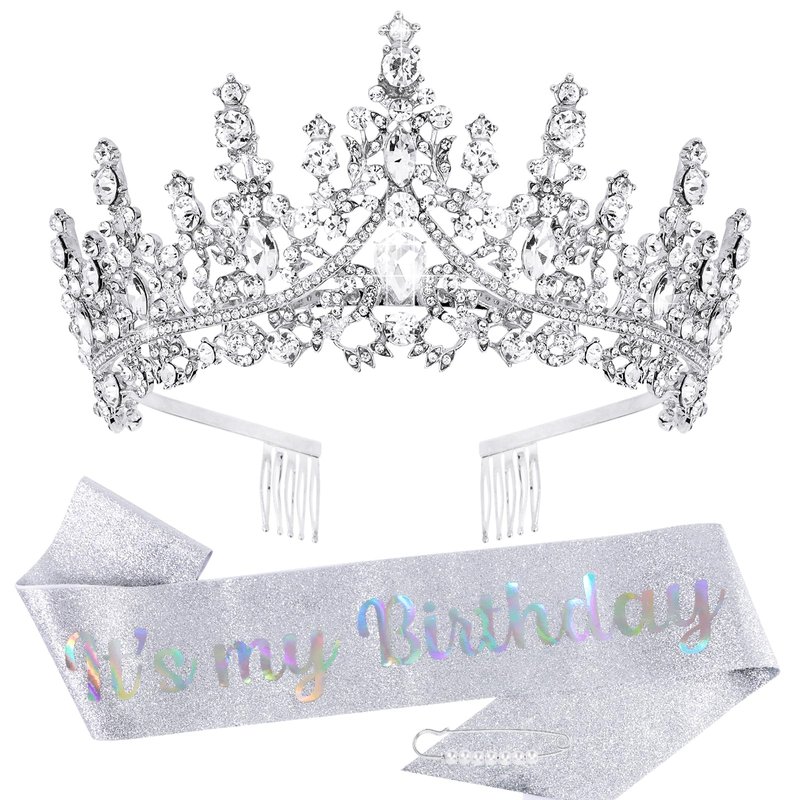 TOBATOBA It's My Birthday Sash Birthday Tiara and Crown for Women Girls Silver Glitter Birthday Sash Crystal Princess Tiara Queen Crown Quinceanera Crown Birthday Decoration Birthday Gift