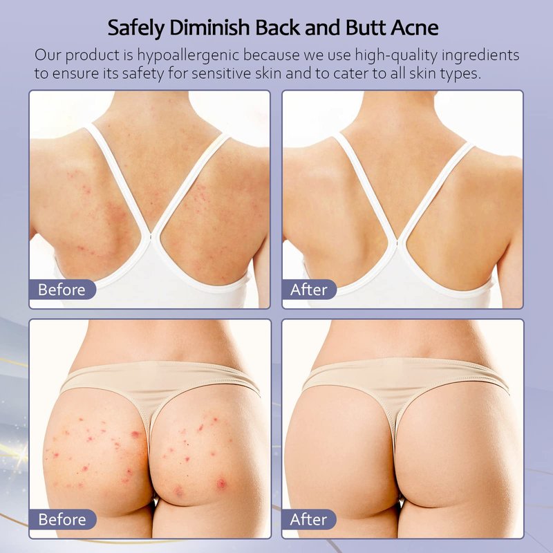 - Hypoallergenic and Skin Safe – We use high-quality ingredients in our advanced butt and back acne treatment to make it safer on sensitive skin and to support all acne scar treatment.