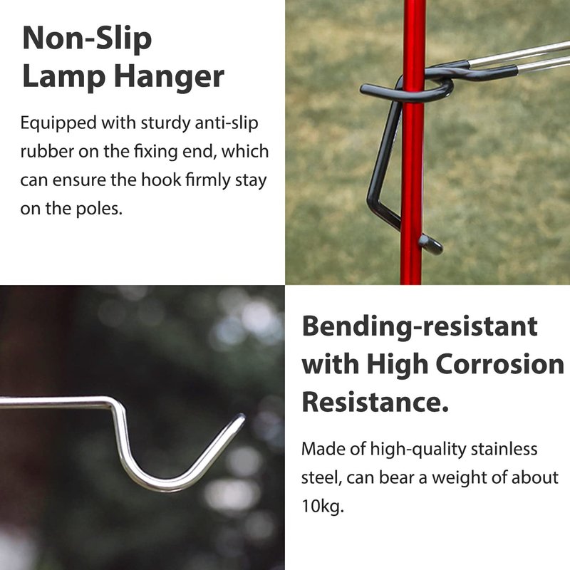 - 💡【Wide Application】-- This light hook is convenient and can bear a weight of about 10kg, which is great for hanging outdoor lanterns, clothes, heaters, water bottles, bags, and any other accessories with string when camping, bivouac, hiking, fishing etc.