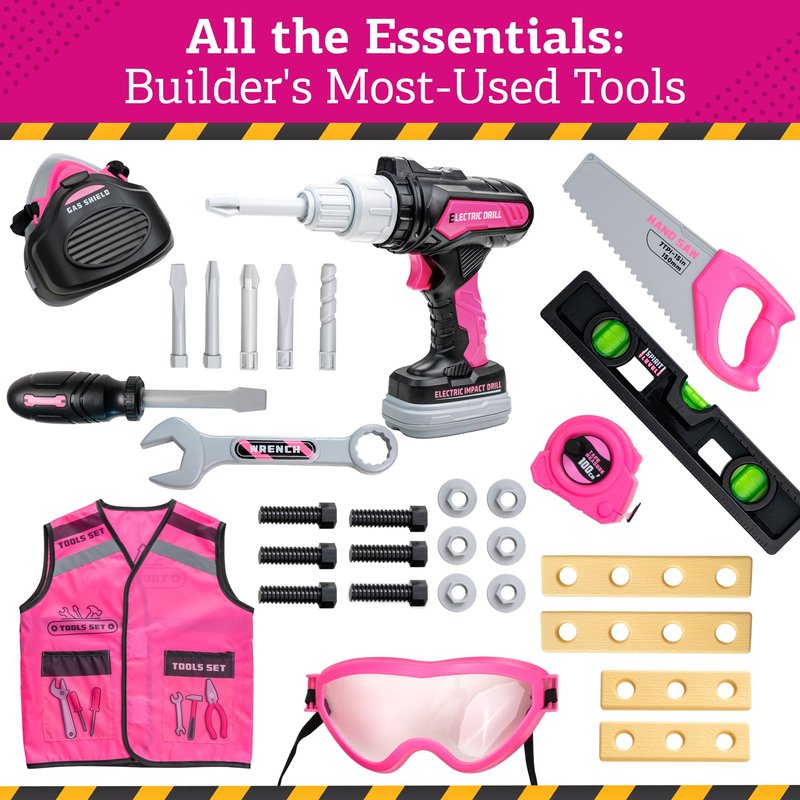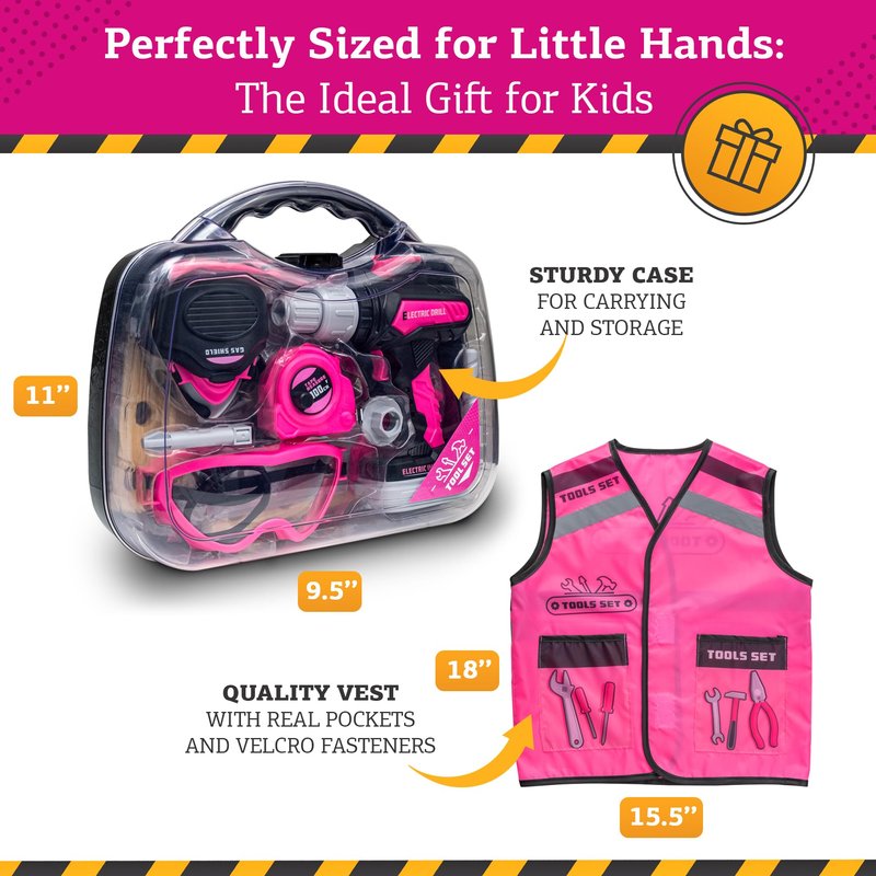 Toddler Girl Tool Set (Pink) with Carrying Case, Electronic Toy Drill & Vest β Pretend Play Tolls Kit with Safety Goggles, Gas Shield, Tape Measure, Saw, Bubble Level, Screwdriver, Nuts & Bolts