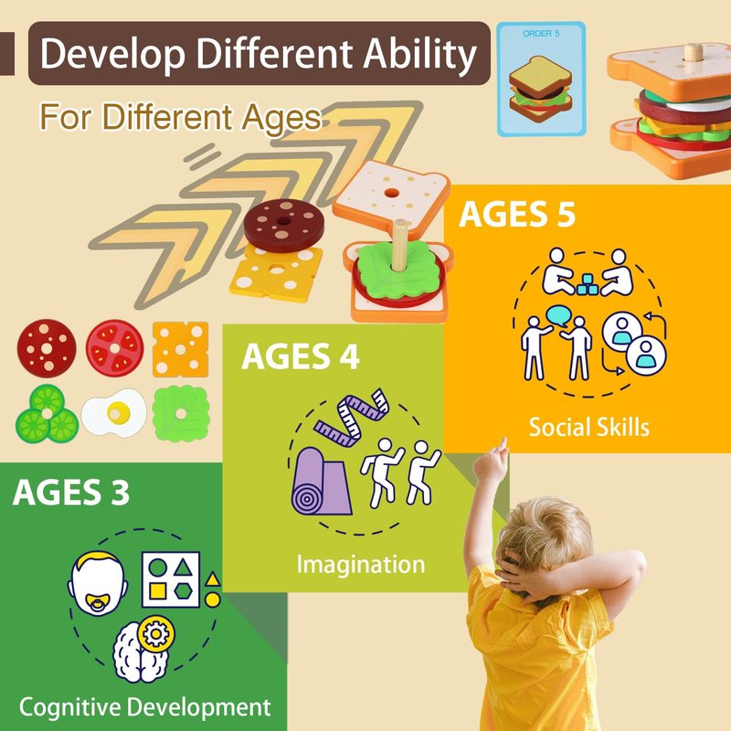- Selecting and stacking different fake ingredients on the bread base to combine them into the food you want. This building block set is easy to use and attract children's attention, stimulate exploration and curiosity, which is helpful for developing toddlers' observation, imagination, concentration and establishing a preliminary concept of food preparation.