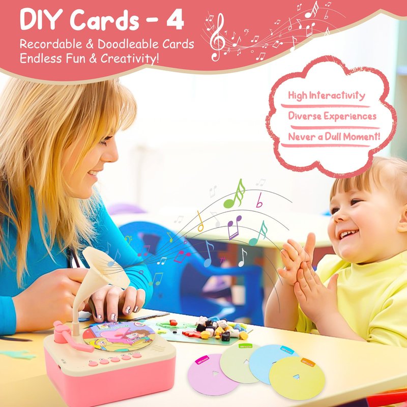 - šInteractive Toddler phonograph with 96 Records: This kids gramophone includes 96 cards featuring stories, aesop's fables, songs and classical music to engage your childās imagination and enhance cognitive, language, and musical skills. It's the perfect early education companion for kids aged 3 and older