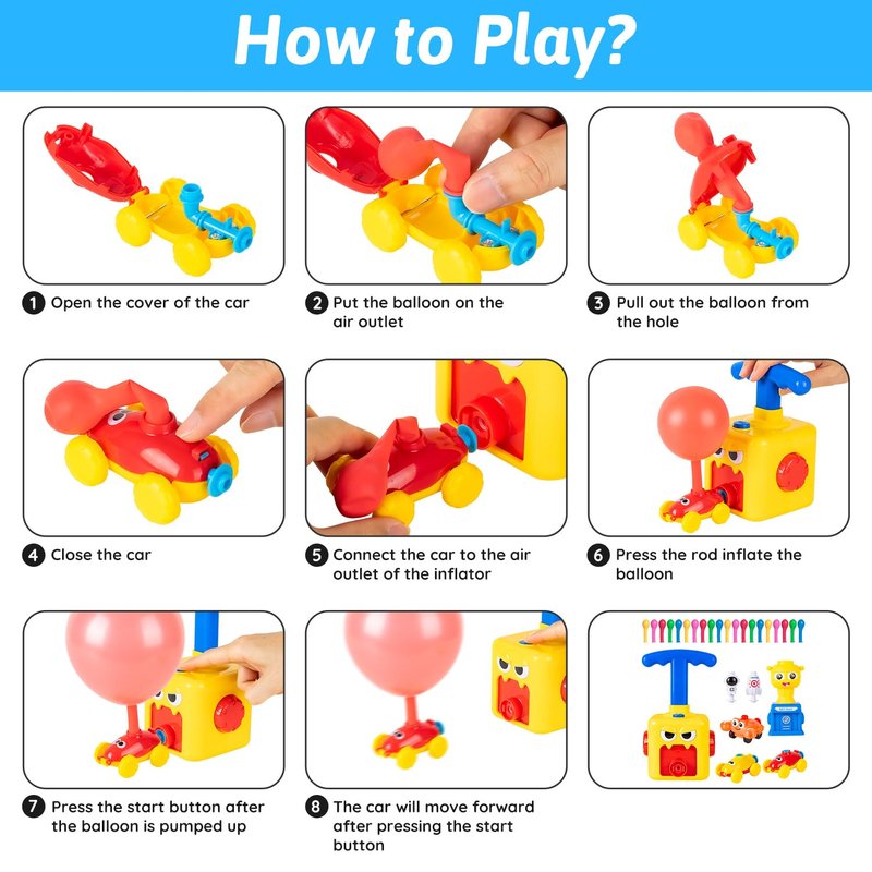 - Intuitive Balloon Race Cars: Just attach the pipe, pump it and fly! For birthday gifts, preschool activities, daycare toys or autism toys for balloon lovers - Order now and “zoom zoom” with Balloon Racers!