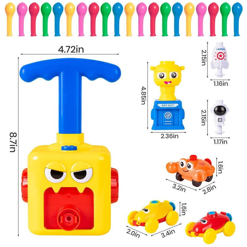 - What’s In The Set? 1Pc Monster-Face Balloon Pump with 1Pc Rocket Launcher Pad. 2Pcs Balloon Car Toy, 1Pc Crab Balloon Cars, 1Pc Astronaut Balloon toys, 1Pc Rocket Ship Toys, 20Pcs Balloons
