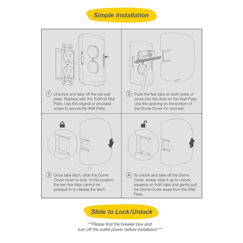 IMPROVED OUTLET SAFETY COVER to give you peace of mind. Your baby or toddler is far less likely to experience an accident or injury. TodPod utilizes an ingenious slide-to-lock mechanism that's easy for adults to open, yet very difficult for a toddler to use. Smooth, fast, effortless one hand open and close for parents, grandparents, and sitters. GENEROUS ROOM INSIDE the box for plugs and adapters. Universally accepts many electrical plugs. TodPod has a generous 5"x3” internal footprint plus plenty of depth (2.7” at the center of the dome) to accommodate phone chargers, smart device adaptors, and those three-prong plugs with thick cables. HARDWARE INCLUDED. You get the safety box, screws for fastening, standard electrical plate, or decorative plate (***Please choose your style according to your needs***) – Install in just 3 simple steps: shut off power and remove the existing outlet plate, insert our plate and Tod Pod, attach with included screws. You're done! PERFECT FOR KITCHEN, BEDROOM, bathroom, garage, kitchen, or anywhere you have an electrical outlet inside your house. Helps keep babies, toddlers, and small children from sticking their curious fingers in dangerous places. GREAT GIFT IDEA: A thoughtful and practical gift for novice and seasoned parents alike! Great for baby birthdays/anniversaries, baby showers, and work-from-home parents.