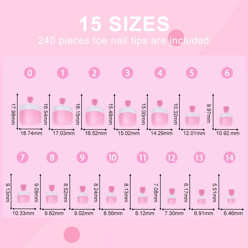 - 【15 Sizes Fit Your Toenails】These short square nails comes in 15 different sizes with 16 nails of each size, which makes it a total of 240 pieces. With the professional nail sizes database, make it easier to find one that suits you.