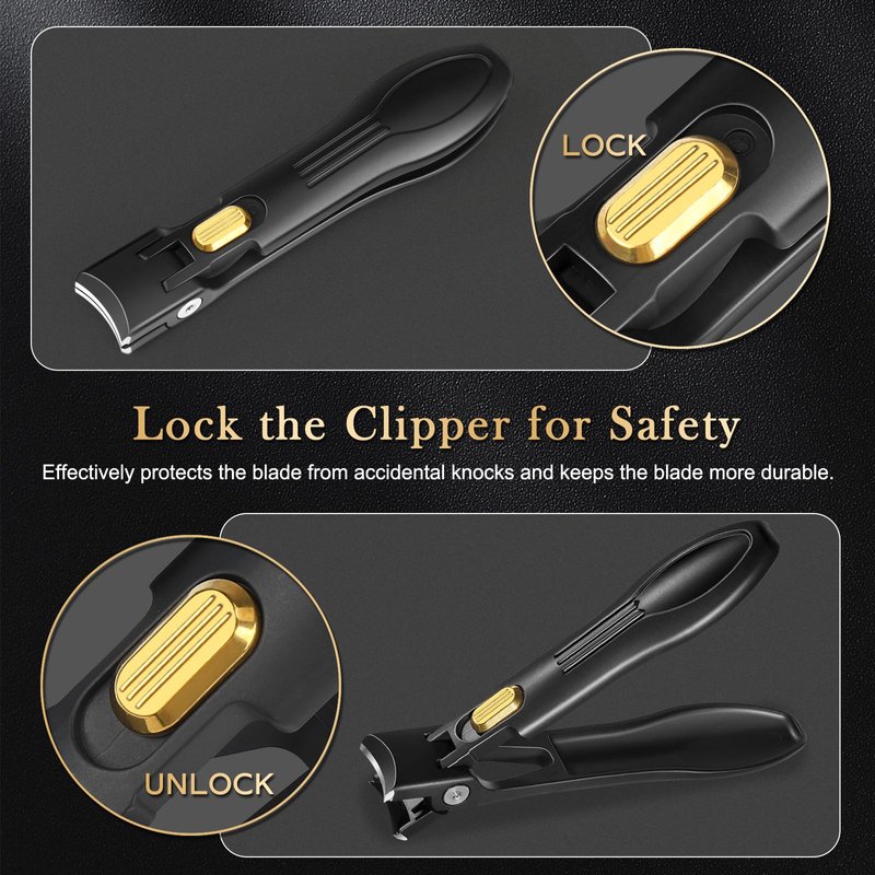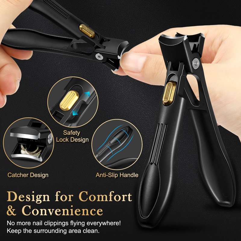 - 【Designed for Comfort & Convenience】No more nail clippings flying everywhere! The upgraded fingernail clippers feature an anti-splash design that makes it easy to store nail clippings in the catcher and keep the surrounding area clean. The unique safety lock design effectively protects the blade from accidental knocks and keeps the blade more durable. The special coating process and groove design on the handle's surface prevents sweating and slipping.