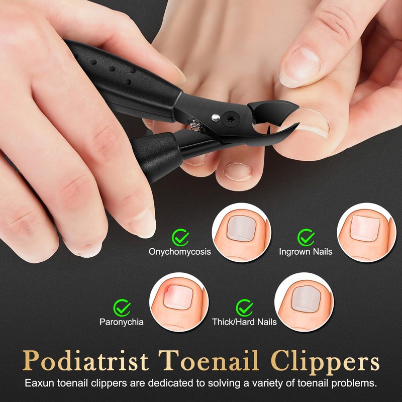 - 【Podiatrist Toenail Clippers】Say goodbye to wimpy toenail clippers that can't handle the tough stuff. Eaxun toenail clippers are designed for thick and ingrown nails. Scientifically 25-degree curved blades fit perfectly into the natural shape of the nail for precise trimming of ingrown toenails and sharp points at the corners. Built-in spring design helps us clip the thickest, most stubborn toenails with ease, saving up to 60% labor! The ergonomic handle provides a more comfortable grip.