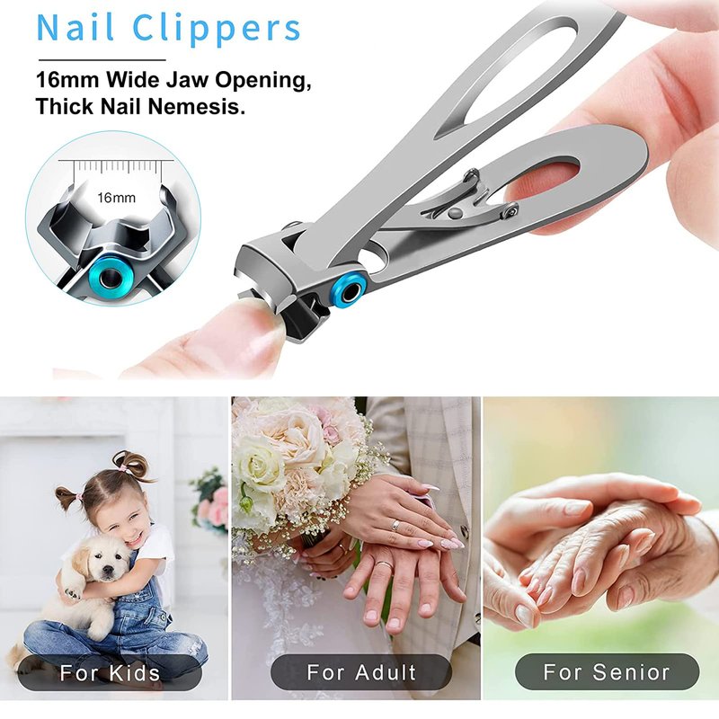 - Wide Jaw Opening Nail Clippers: Extra Wide Opening Nail Clipper for thick nails wider than the opening of ordinary nail clippers, and can be opened up to 16mm, which can easily clip any thick nails. Nail clippers for thick nails adopt an innovative lever design that reduces the pressure required to cut your nails, allowing you to cut hard and thick nails with ease.