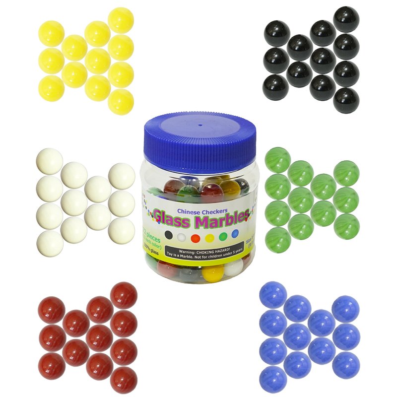 This set includes 72 top-line quality marbles in a marble jar. The package contains 6 different and vibrant colors: Black, White, Yellow, Blue, Green and Red, 12 Marbles of Each Color. This marbles are great for super fun games like Chinese Checkers, Aggravation Game, Marble Run or Traditional Marbles Games. The diameter of each marble is approximately 9/16 inch (14 mm). Please note marbles may have slight variations in size.