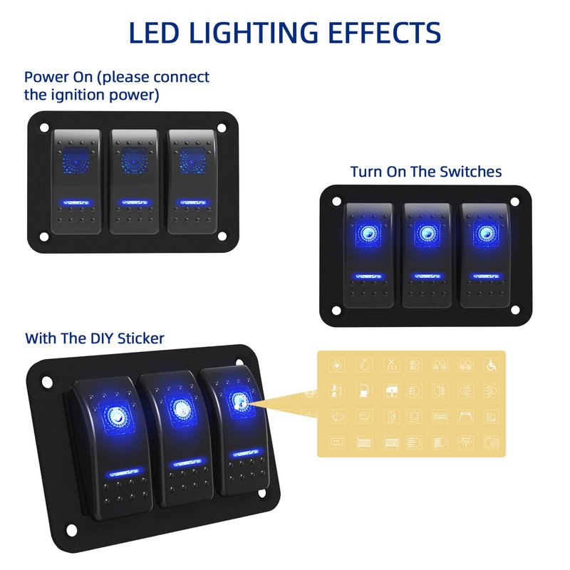 - [Premium LED & DIY Sticker]: Our rocker switches have 2 blue LEDs, they can illuminate and help you to find the switches in the dark easily, and you still can assign your switches as your needs with the DIY sticker, they will give you a good experience.