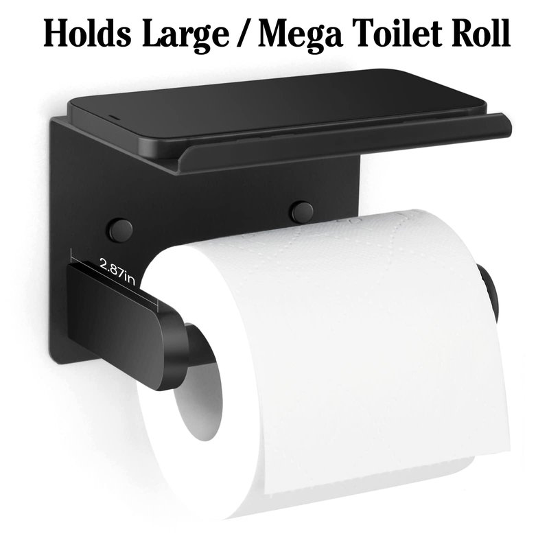 - Toilet Paper Holder with Shelf - This toilet paper holder has a large storage shelf, which can hold some bathroom accessories such as phone, small plants, keys, watches, glasses, wet tissue and air freshener. Special front folding design of this black toilet paper holder to prevent the slipping of everything you put. This toilet paper holder with shelf can be applied in the bathroom or washroom.