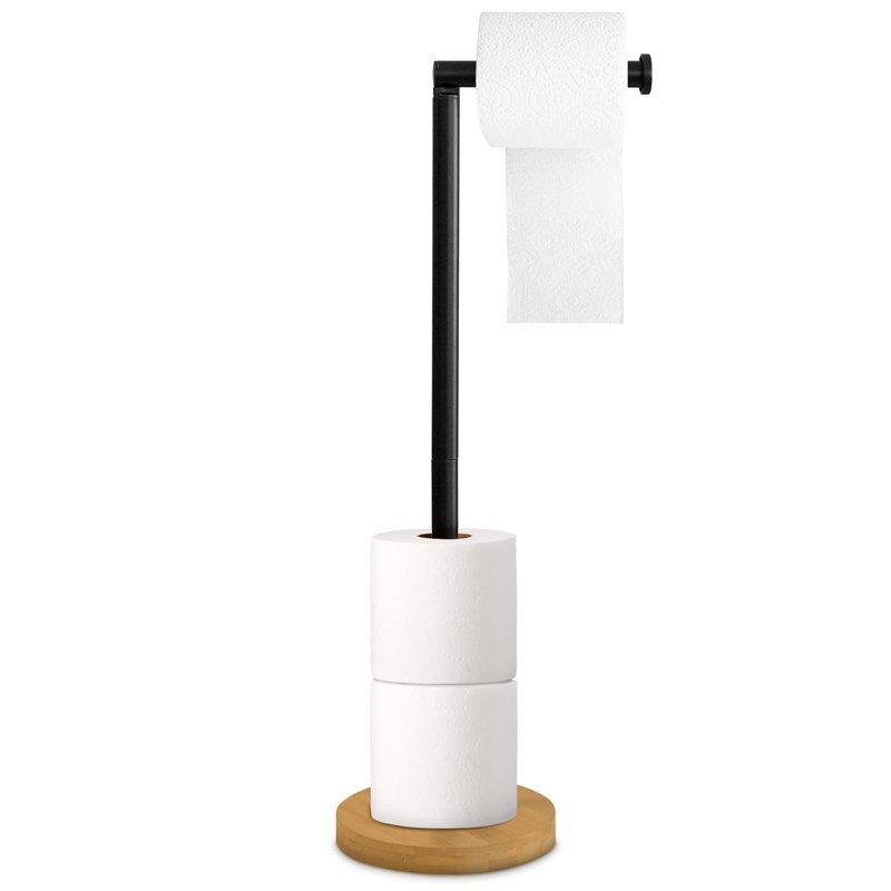 - MODERN AND STYLISH DESIGN: The sleek black metal stand and natural bamboo base of this toilet paper holder are designed to complement any bathroom décor. The modern and stylish design adds a touch of elegance to your bathroom, making it a great addition to any home.