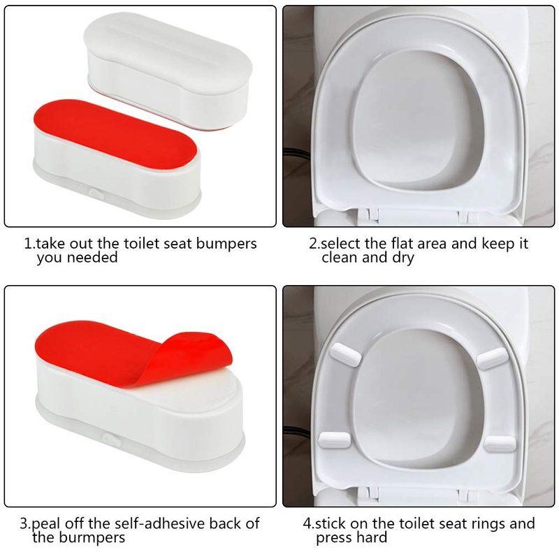 - Easy to use: Keep the toilet seat rings clean and dry, peel off the self-adhesive back side of bumper, and stick it on the flat area of toilet seat rings, press hard and use it 10 minutes later.
