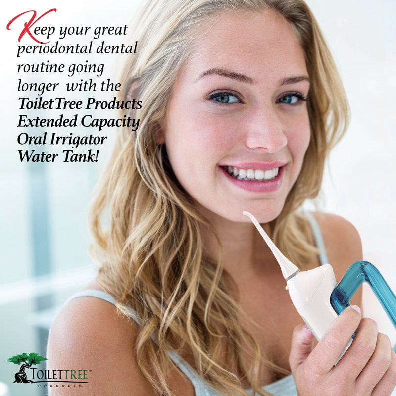 Make your cordless handheld orthodontic dental device work a little longer without having to stop to refill the tank when you use the ToiletTree Products Extended Capacity Oral Irrigator Water Tank. This larger container and 1 replacement tip is compatible with ToiletTree Products, Poseidon, Broadcare, Gurin, Wellness, SmartToiletries, and Aqua Flosser (irrigator not included). ToiletTree Products irrigator products provide an easy and effective way to support complete and proper teeth and gum care and health at home and on the road. Daily irrigation with an electric toothbrush helps reach places brushing simply cannot, promoting cleaner teeth and healthier gums. The result, an incredibly clean, fresh happy mouth. Irrigating is easier and less abrasive than string floss. It’s great for hard to reach spots, especially for people with bridges and braces. Keep your great periodontal dental routine going longer with the ToiletTree Products Extended Capacity Oral Irrigator Water Tank.