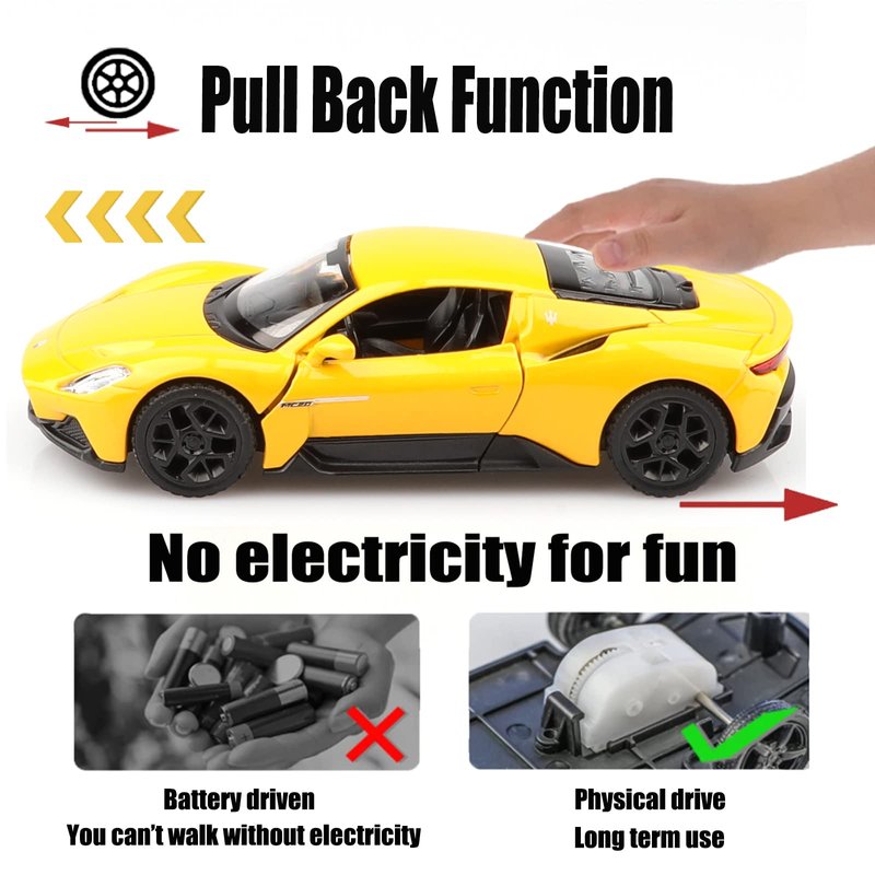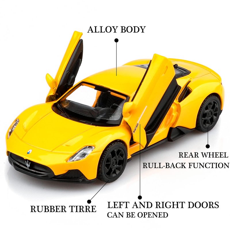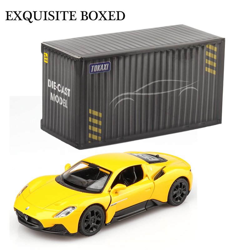 TOKAXI Maserati Die-cast model cars are made of high-quality alloy materials and are miniature replicas of real cars. These car toys are small enough for kids' hands to handle, made cutely and easy to control. They're very handy to carry wherever you go. This car doesn't require batteries- just pull it back and watch it go! This is a great way to help children exercise their hand-eye coordination and reaction speed. The car door is designed to open separately, making it easy for children to learn about cars. The realistic interior decoration is also enjoyable and educational. You can use it as an ornament in your home or put it on your car to show your appreciation for art. This pull-back car is not just a toy for kids but also a nice addition to enthusiasts' car model collection. We have a wide selection of cars to choose from, so you can find the perfect one for your collection from our products. All of TOKAXI die-cast model cars are attractively packaged in English, making them the perfect Christmas, Birthday, Children's Day, New Year gift for kids, party favors, home decorations, or travel toys for boys and girls.