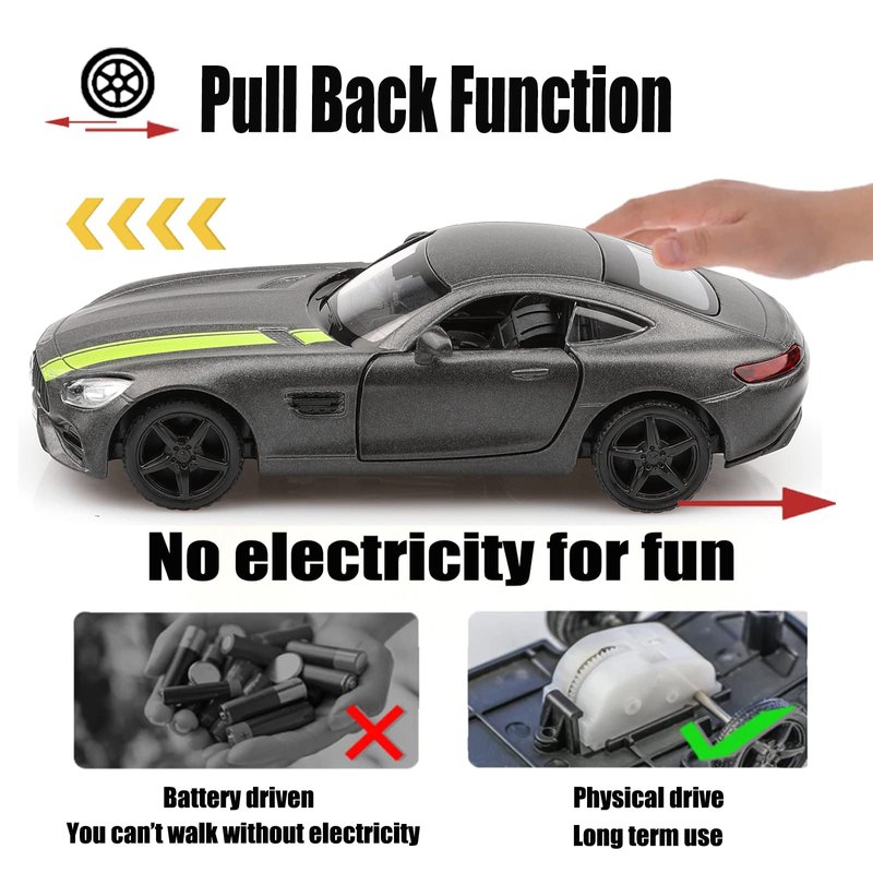 - High-Quality Materials:The Mercedes Benz GTS die-cast car is made of zinc alloy,plastic parts and rubber tires,making it safe for children to play with.It features detailed interior and exterior trim, and is very sturdy.