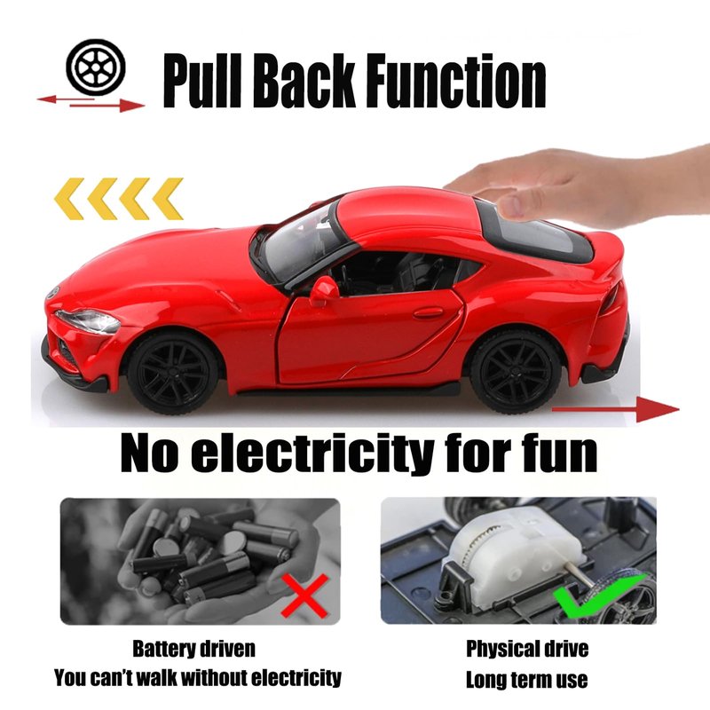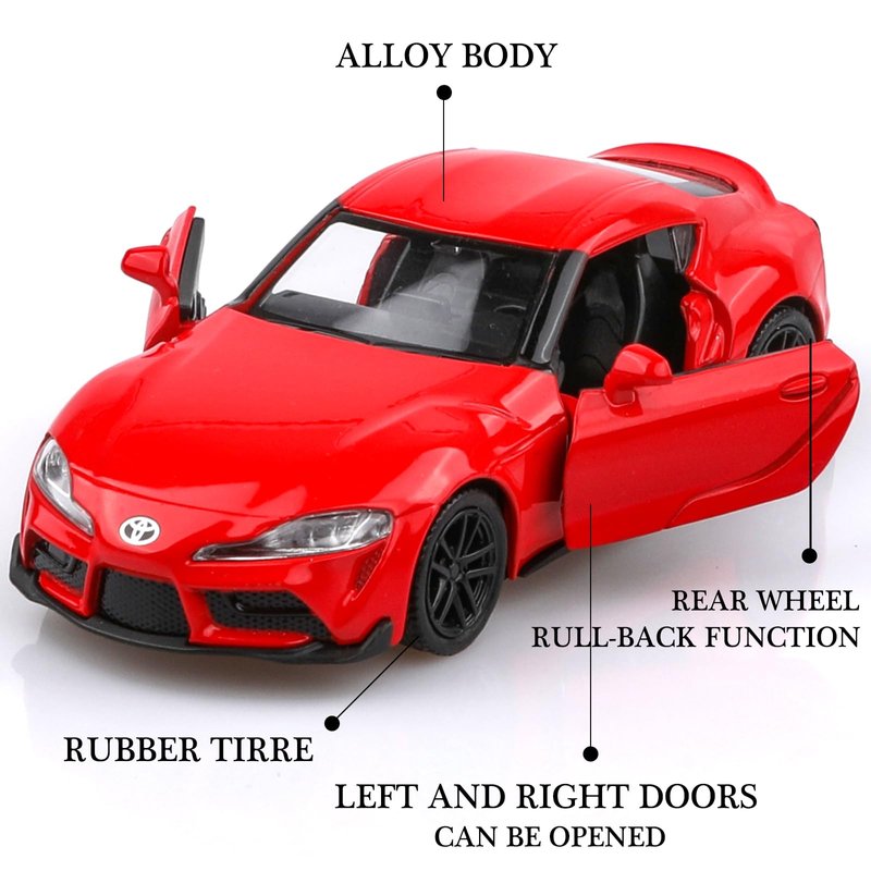 - High-Quality Materials:The TOYOTA Supra die-cast car is made of zinc alloy,plastic parts and rubber tires,making it safe for children to play with.It features detailed interior and exterior trim, and is very sturdy.