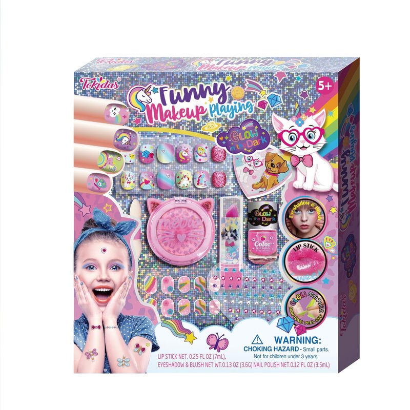 Tokidas Kids Makeup Sets Funny Makeup Playing Glow in The Dark Press on Nails Eyeshadow Blush Lip Stick Gem Stickers Kids Toys for Birthday Gifts