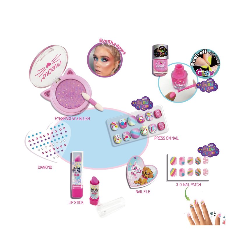 - Imaginative Fun: This makeup play set encourages creativity and imagination with a wide array of vibrant, scented nail polishes, press-on nails, eyeshadows, blushes, and lip glosses.