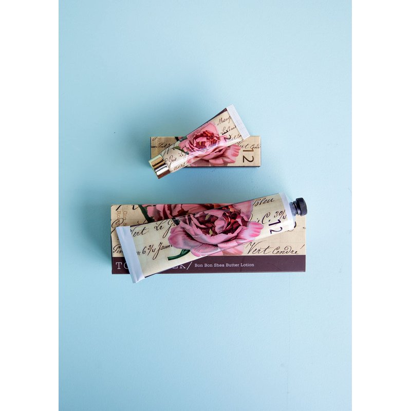 - EASILY ABSORBS INTO SKIN: For best results, massage a small amount of the shea butter lotion on clean hands until absorbed. May be used as often as needed. Luxe aluminium tube and keepsake sliding box features a vintage rose image of a botanic watercolor.