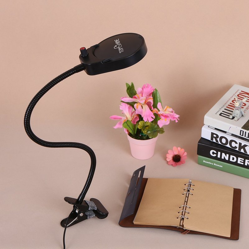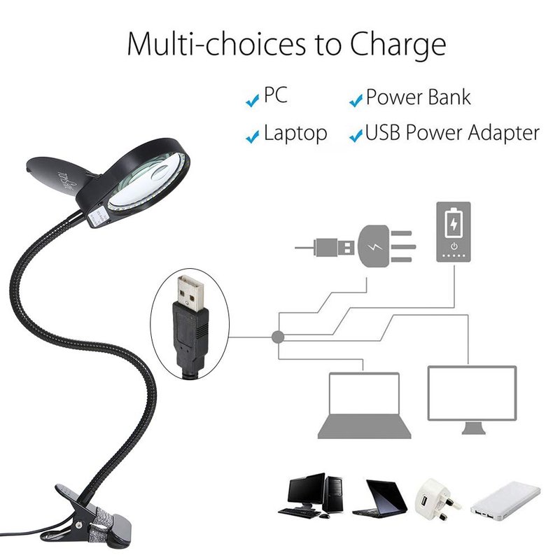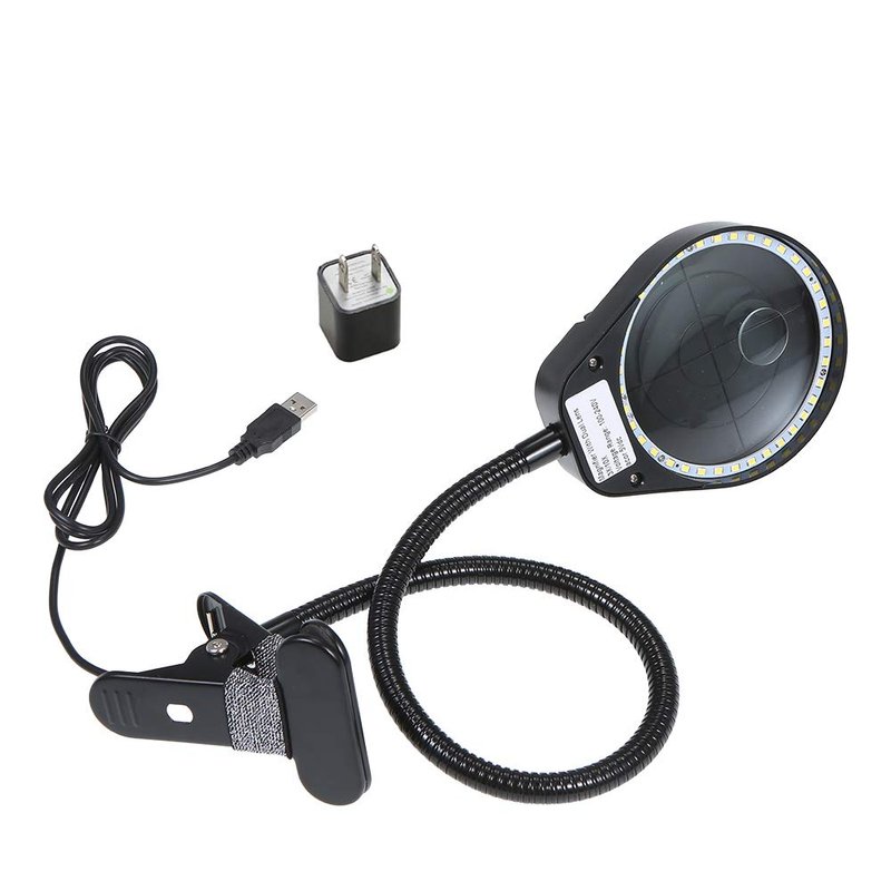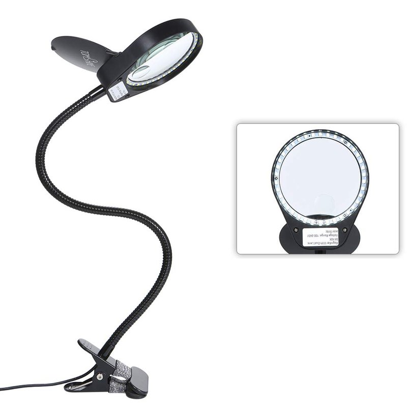 - [Flexible Position] Lighted lamp with flexible metal gooseneck & adjustable 7.5cm clip, swivels 360 degrees so that you can position the light where you need it most. Great magnifying tool for carving, jewelry identification, painting, crocheting, repairing electronics, etc.