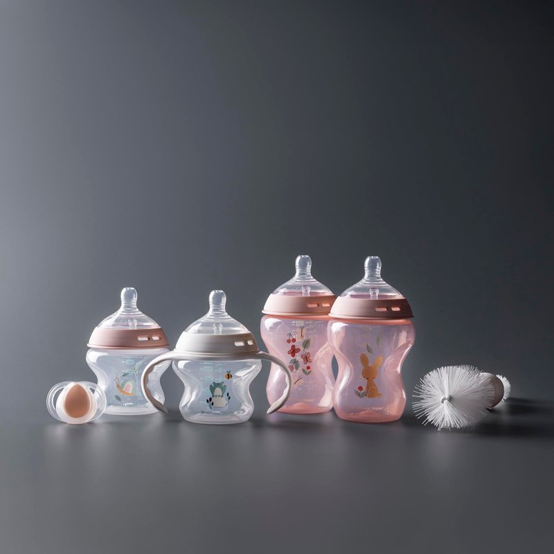 Tommee Tippee Natural Start Baby’s First Bottle Set, 2 x 5oz and 2 x 9oz Anti-Colic Bottles, Slow and Medium Flow Nipples, 0-6 Month Pacifier, Self-Sterilizing, Pink