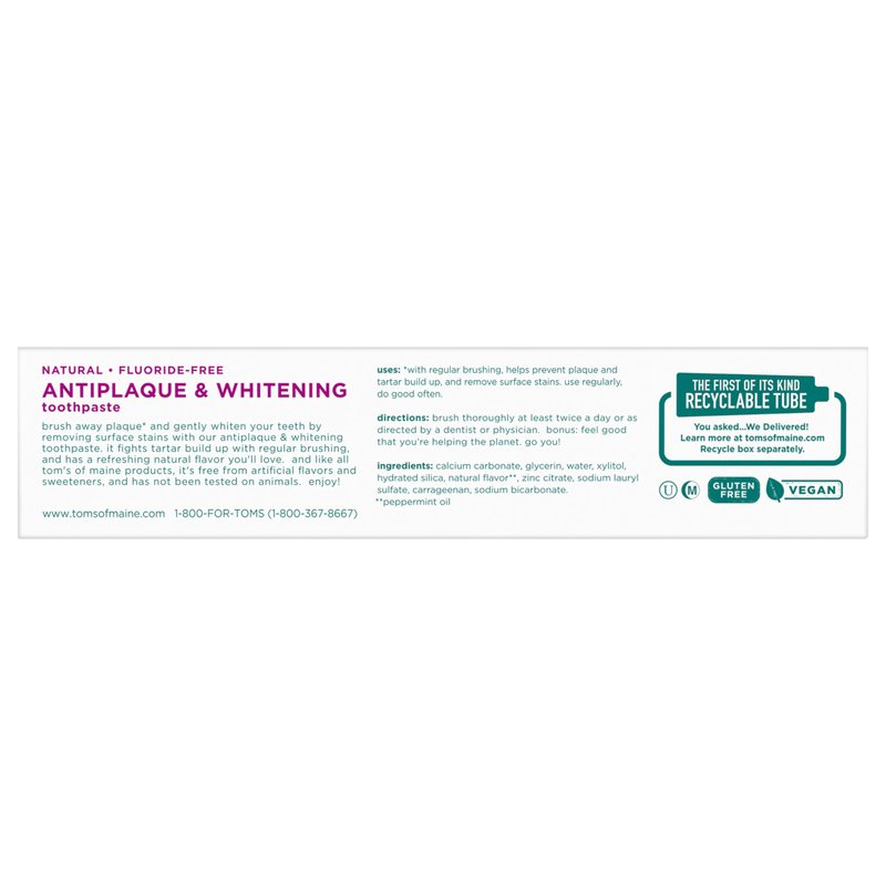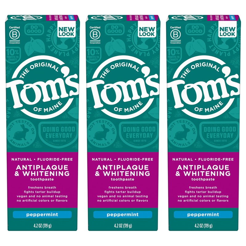 - WHAT YOU'LL GET: Three 4.2-ounce tubes of Tom's of Maine Natural Fluoride-Free Antiplaque & Whitening Toothpaste in Peppermint Flavor