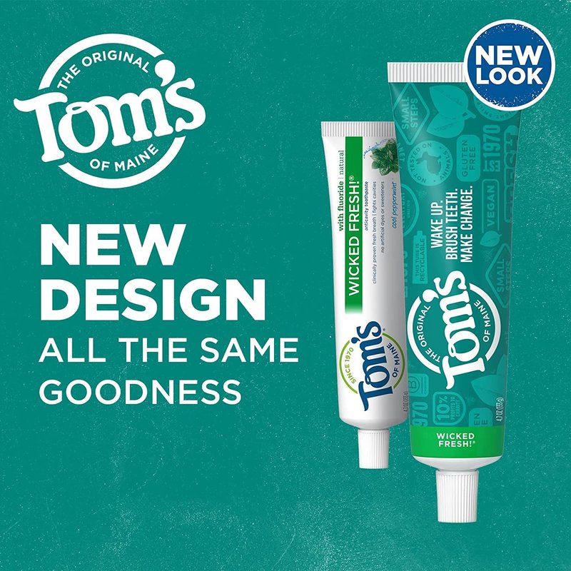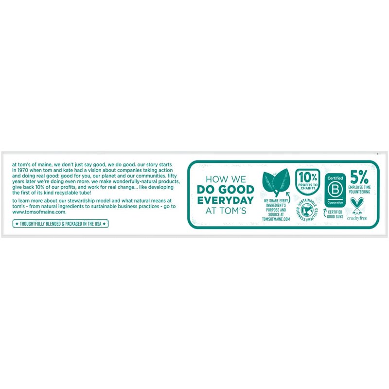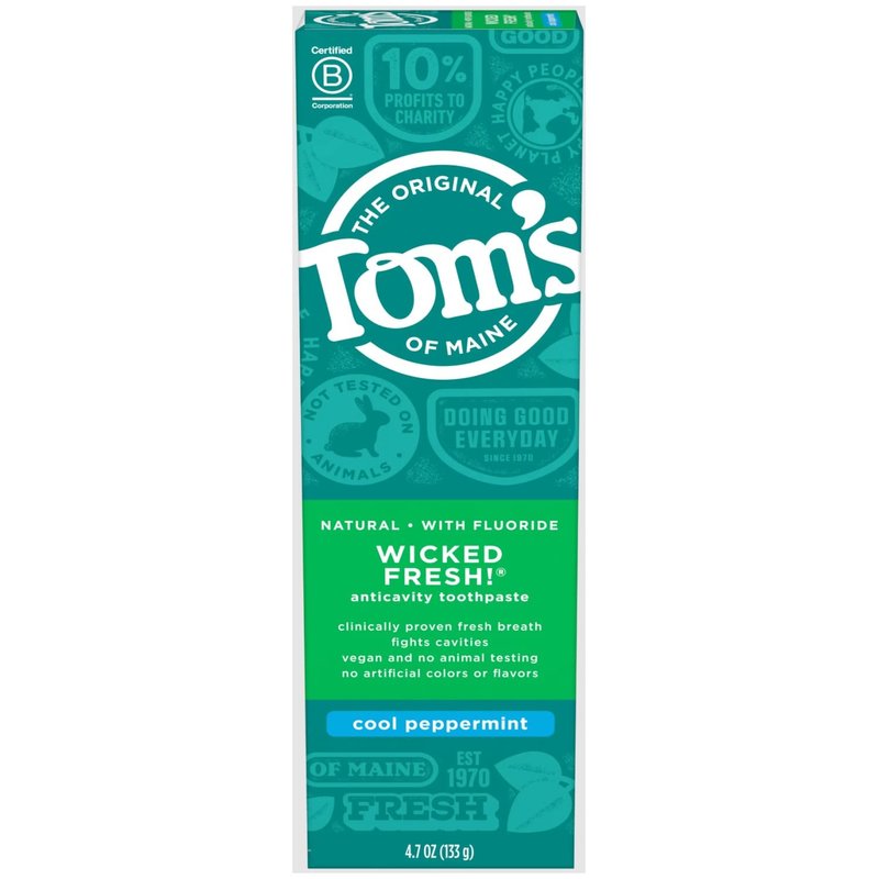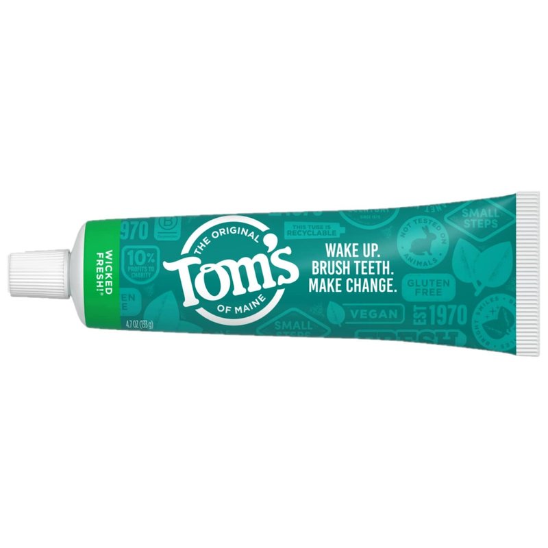 #1 Natural Toothpaste Brand, (Based in part on data reported by Nielsen through its Connect Service for the Toothpaste Category for the 52 week period ending 8/27/22, for the AOC market. Copyright 2022 Nielsen.) Long-lasting fresh breath is only a brush away with Tom's of Maine Wicked Fresh! Natural Toothpaste With Fluoride. This natural toothpaste contains licorice root extract to help block bad breath germs from producing odor. How cool is that? Plus, the fluoride helps strengthen enamel and fight cavities to promote a healthier smile. Finish it all off with the sweet, natural taste of Spearmint. And when you're done using your toothpaste, you can recycle the tube! Check to be sure that your tube has the blue recycling flag on it, squeeze out as much of the toothpaste from the tube as you can, replace the cap, and place the tube in your recycling bin. Order Tom's of Maine Toothpaste, and discover our range of natural oral care products. At Tom's of Maine, we want to empower families to live more naturally. With more than 50 years experience combining scientific know-how, naturally derived ingredients and a bit of ingenuity, we make products that are good for you and the planet. As a Certified B Corp, we hold ourselves to the highest social and environmental standards. Plus, we're committed to supporting local communities for meaningful change, donating 10% of our profits to charities supporting health, education and the environment. We call this "doing good, for real," and it impacts everything we do