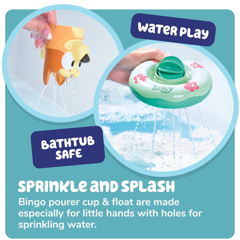 - WATER SPOUT TOY: The pouring cup of the Bingo bath toy is designed for little hands. Pour water onto the water wheel to spin it and lift the float to see the water flow through the shower holes under the float.