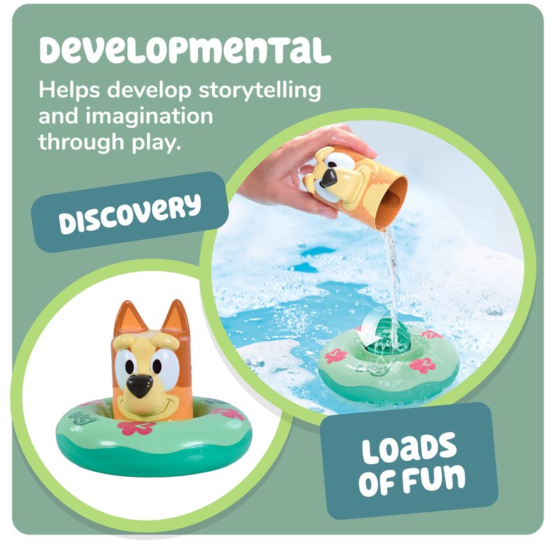 - FLOATING KIDS BATH TOYS: Make your kids happy at bath time with the Bingo Bath Ring for 18 months and up. Bingo moves on a colorful pool float - Lift it up to reveal a ready to spin water wheel!