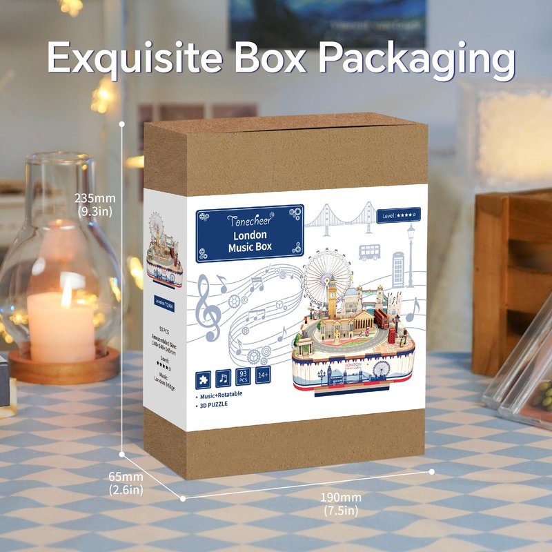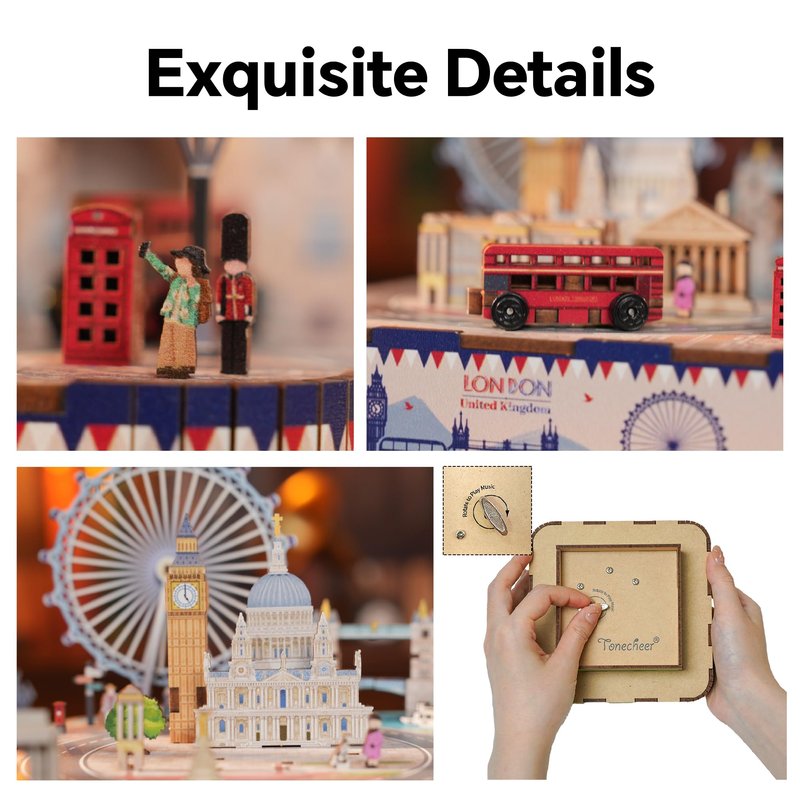 - 【London Music Box】In Tonecheer DIY music box kit, Britain's landmarks stand along the foggy River Thames. Next to the majestic Buckingham Palace is the classical St. Paul's Cathedral, and as you ride the London Eye, the world's first Ferris wheel, to the highest point, you can still hear the chimes of Big Ben slowly coming into your ears.
