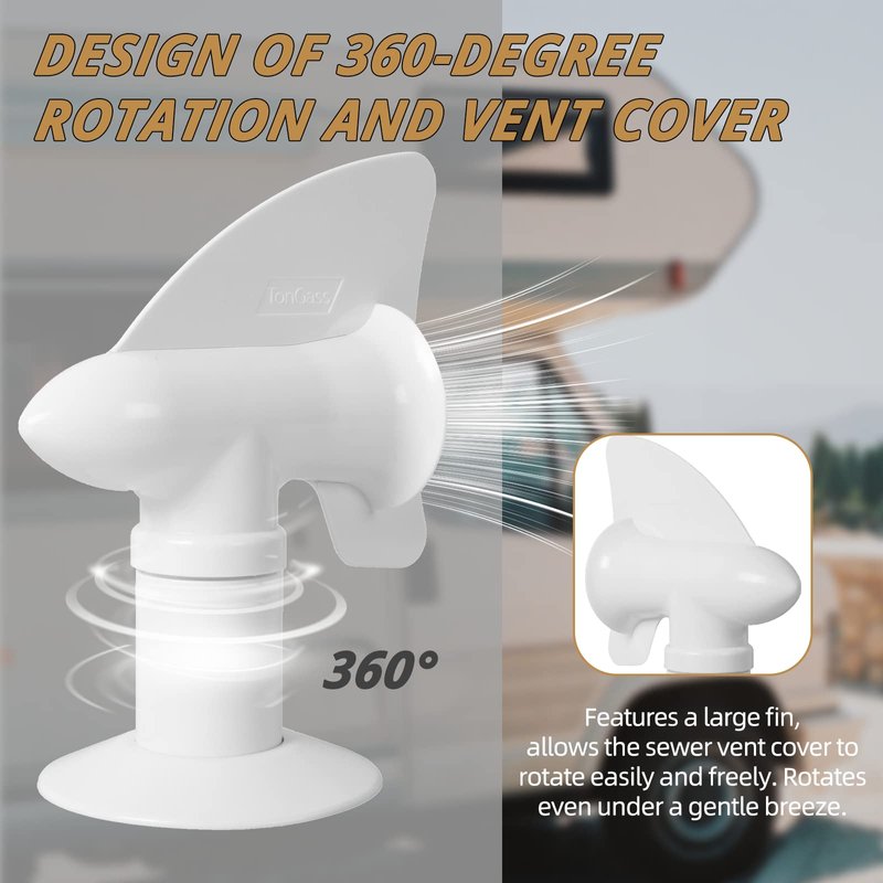 Automatic Rotation RV Sewer Vent Cover Rotates even under a gentle breeze. The intuitive design allows the sewer vent cover to rotate easily and freely. And as the sewer vent cover rotates 360 degrees, it’s always facing the wind. Rotating RV Sewer Vent Cover Specifications: Diameter (Fin): 8.63 inches Width: 11.5 inches Height: 3.38 inches Weight: 0.55 pounds Designed for RV, trailer, and camper holding tank vent use. Creates a Powerful Vortex to Draw Out Odors The 360-degree rotation and the vent cover design will enable a strong air vortex to form. This creates a vacuum effect that will suck the odors out of the holding tank and dissipate them away from the RV.