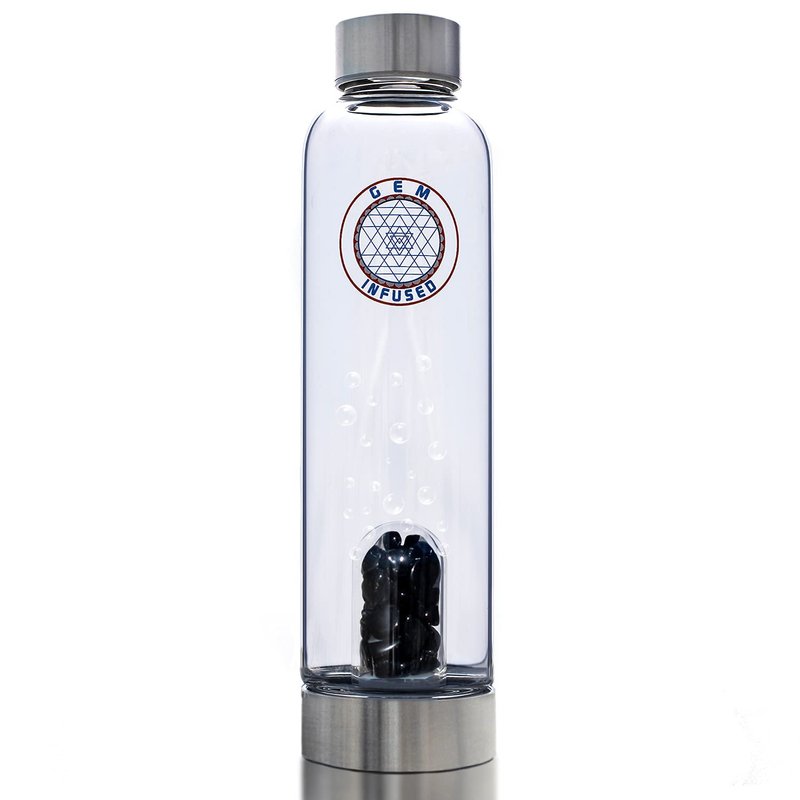 TonicCure Gem Infused Crystal Water Bottle Elixir with Authentic Healing Wellness Brazilian Stones Obsidian Neoprene Sleeve, for Love Peace and clarity 16 oz (BLACK Obsidian)