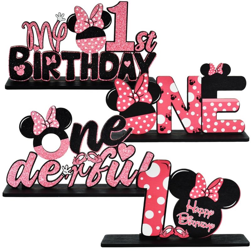 Minnie mouse birthday decoration 1st,Minnie Mouse party decorations,1st birthday decorations Product Theme: Cartoon Mouse Birthday Party Supplies, Cartoon Mouse Party Decorations, Cartoon Mouse Centerpieces for Tables, Cartoon Mouse 1st Birthday Party Supplies,One Year old Birthday Decroation. Product Brand: TONIFUL Product Size: Four insert card sizes: 145x102mm, 195x105mm, 195x108mm, and 195x110mm Base sizes: 200x50mm x 4 Product Color: Pink and Black Product Design: minnie Mouse theme, Wooden material, Eco-Friendly, Tight Fittings with no risk of falling. TONIFUL Minnie Mouse Table Centerpieces: Our beautifully designed table centerpieces are perfect for your Mickey Mouse themed 1st birthday party. Made from eco-friendly wooden material, they are sturdy and durable with tight fittings to prevent any fragile parts from falling off. Creative Design: Featuring a lovely Mickey Mouse theme, this party decoration is perfectly suited for your little one's 1st birthday party. The design is clear and the colors are vivid, adding a touch of charm to your event. High-Quality Materials: Our centerpieces are made from premium quality wooden materials and painted with non-toxic paint, ensuring their safety and longevity. They are perfect for reuse and look as good as new after multiple uses. Perfect for Photo Props: Not only are our centerpieces great for table decoration, but they also serve as perfect photo props. They will make your baby's 1st birthday even more memorable and special. Versatile Uses: Our Mickey Mouse table centerpieces can be used for a variety of occasions, including baby birthday parties, home entertaining, everyday use, and more.