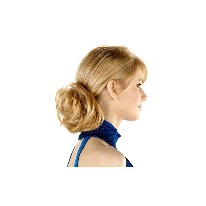 Swirly is a twist-around hairpiece with a soft curve on a elastic band. Heat-resistant* fibers can be re-curled, re-styled or straightened with a temperature-controlled (up to 350 degrees) curling or flat iron. Can be worn either at the nape or the crown.