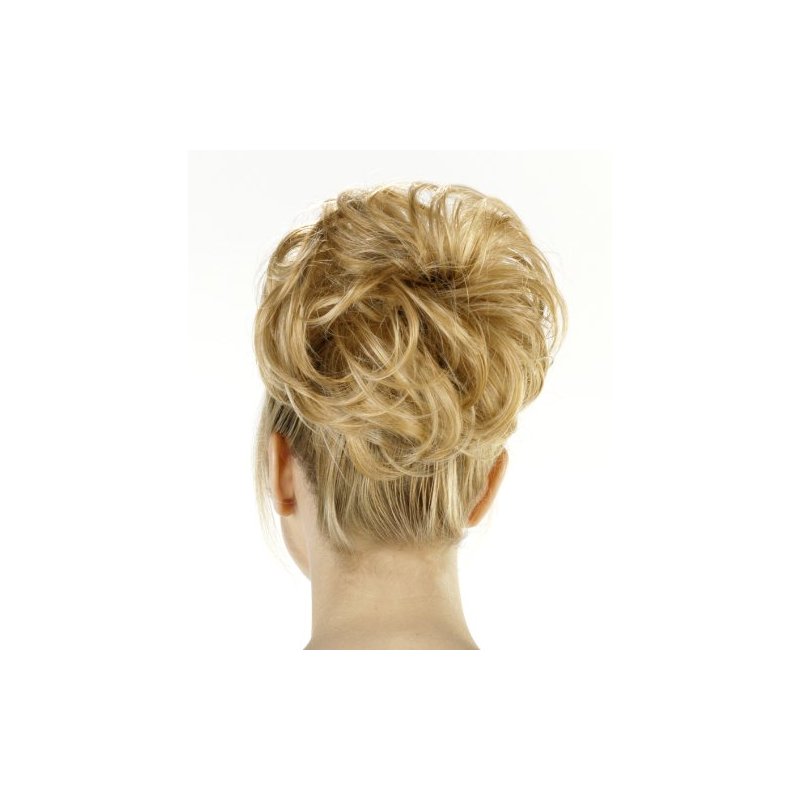 Swirly is a twist-around hairpiece with a soft curve on a elastic band. Heat-resistant* fibers can be re-curled, re-styled or straightened with a temperature-controlled (up to 350 degrees) curling or flat iron. Can be worn either at the nape or the crown.