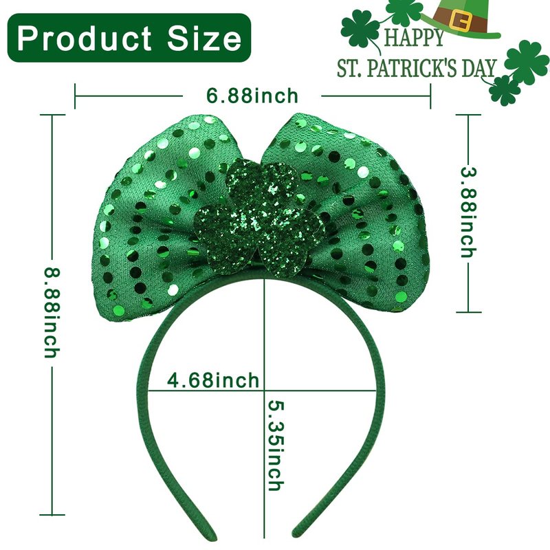 - ☘️ St Patrick's Day Headbands:The package bow with clover green headbands. 1 size is 6.88 X 8.88 inches. These glittery and fun shamrock headbands are explicitly designed for getting into the St Patrick's Day spirit.(3 styles for you to choose from,LUCKY SHAMROCK HEADBAND, BEAUTIFUL BOW HEADBAND, CUTE CARTOON with SHAMROCK HEADBAND)