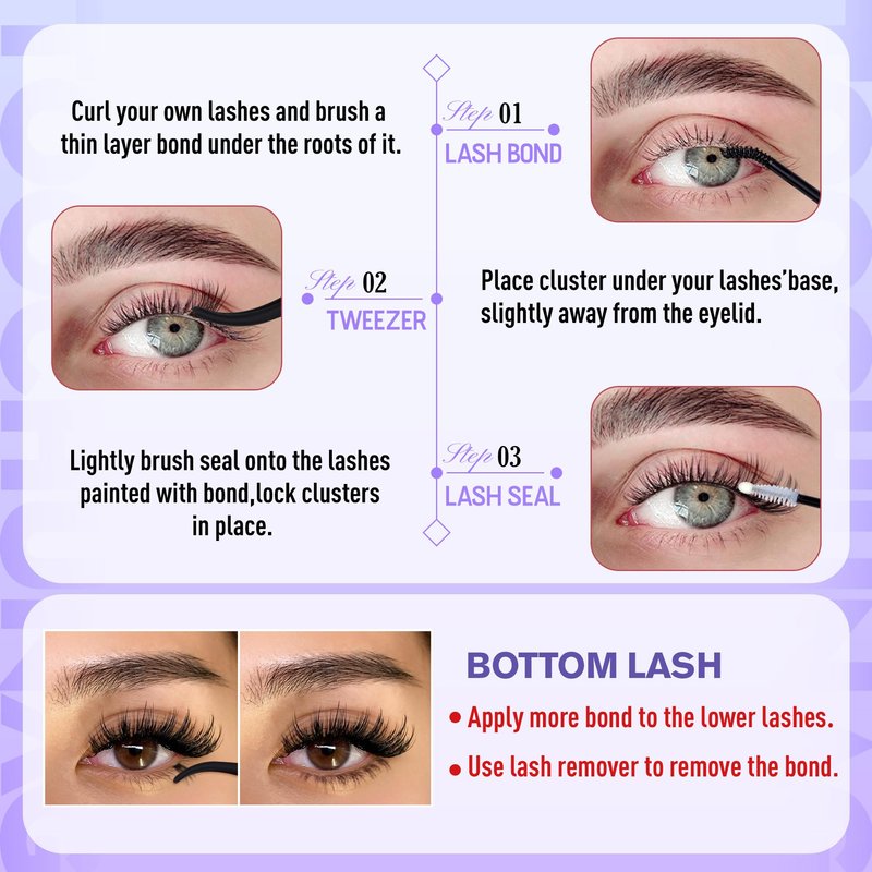 - Please note: If you want longer lasting lash extension, Put the bond on your own lashes and some extra on the lash bands. The cluster lashes bands are thin, so be careful taking them off.