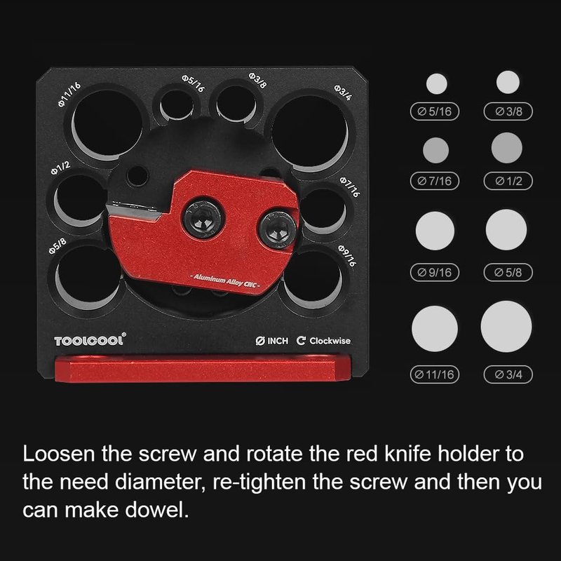 8 diameters can be selected,loosen the screw and rotate the red knife holder to the need diameter, re-tighten the screw and then you can make dowel.