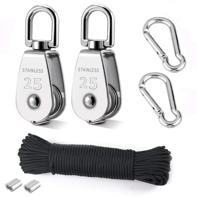 - M25 Satinless Steel Pulley and Rope Kit : 2Pcs 25MM Crane pulley wheel,2Pcs x Carabiner Snap Hook Clips,20 meter Nylon Pulley Line rope.Loading 150 kg/300LB