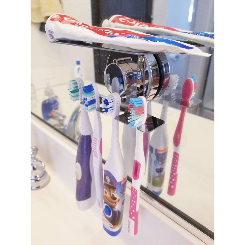 Toothbrush holder jewelry organizer for MIRROR WALL BATHROOM SUCTION CUP, EASY INSTALLATION Fits 9mm WIDE toothbrushes which is 95% of all toothbrushes in the market. SLOTS – Holds 4 toothbrushes: electric & traditional. Has space for your RAZOR. HIGH QUALITY304 Stainless-steel holder is rustproof with a very classy chrome, suction can hold up to 10lbs. 100% Satisfaction Guarantee!