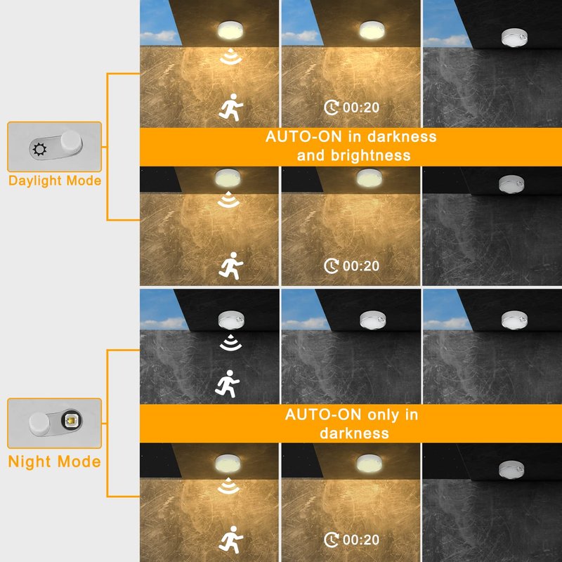 - Upgrade Daylight/Night Mode: Slide the switch to turn photocell sensor on/off. Under DAYLIGHT mode, the light could be motivated on all day long, and under the NIGHT mode, the light only could be motivated on at night. Humanization design to convenient variety house illumination