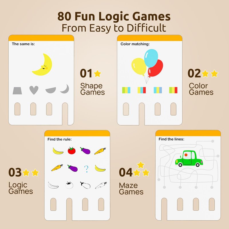 - What’s Included: The learning toy features 40 double-sided flashcards with 80 questions, including shape recognition, color matching, and geometric splitting. Our colorful cards are designed not just to entertain but to help your little ones develop essential skills like logical thinking and concentration. Great montessori toys for 3 year old kids