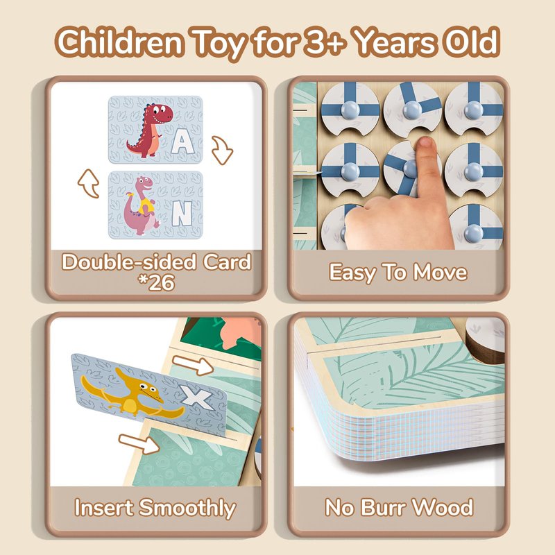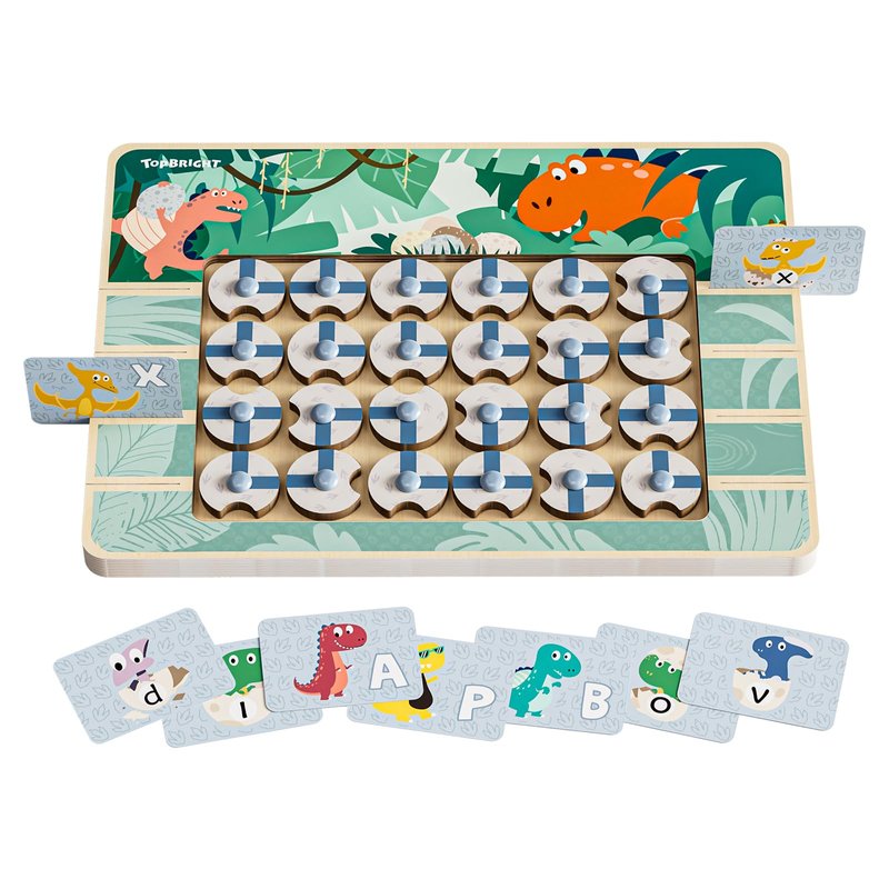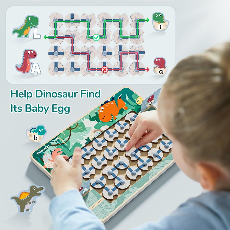 - DINOSAURS APHABET MATCHING SET: Helping dinosaurs find their baby eggs. Children will learn to recognize and match letters by inserting them into card slots on both sides and rotating wooden blocks to build the correct path. Improve children's hand-eye coordination ability, imagination, and fine motor skills.