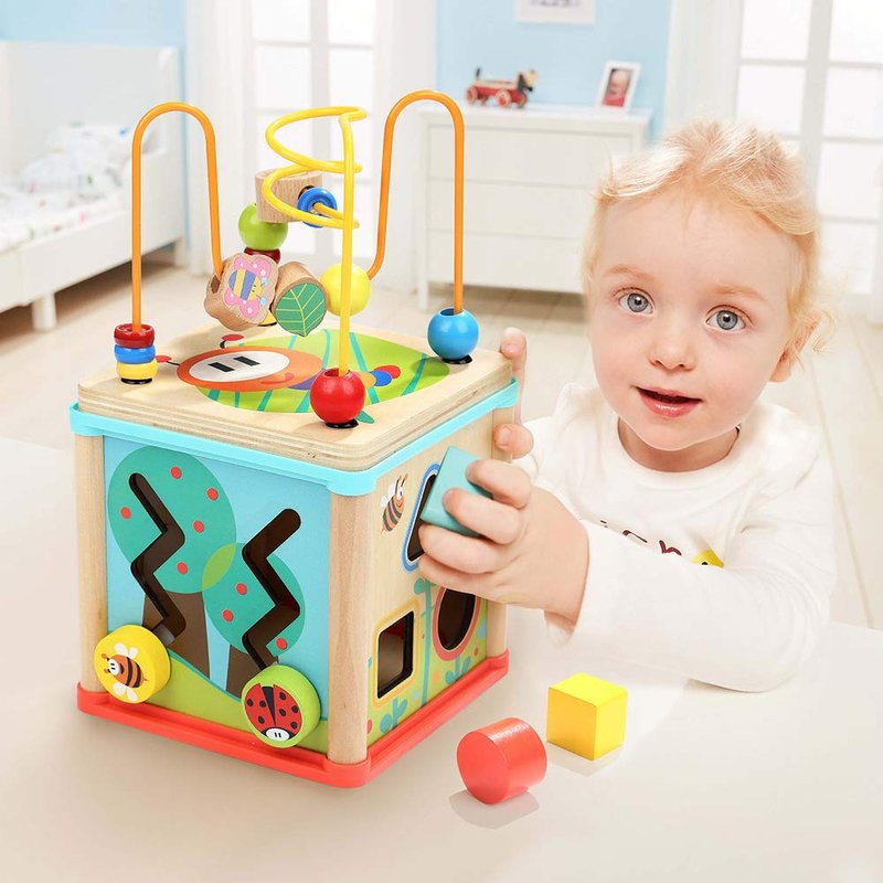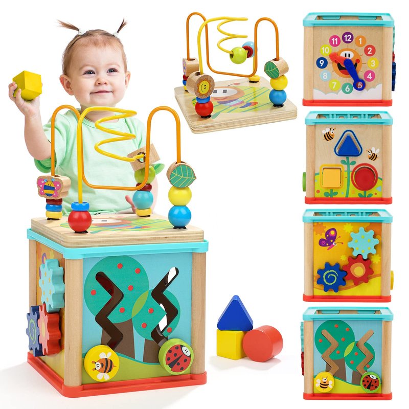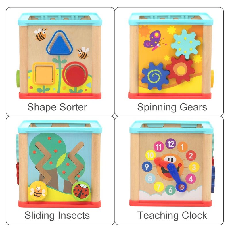 - 5 In 1Activities - Our activity cube for 1 year old combines 5 different activities in 1. Bead maze, Learning clock, Shape sorter, Spinning Gears and Zig zag sliding side. This development toy keeps children busy and entertained, while developing their logical thinking, imagination and creativity.